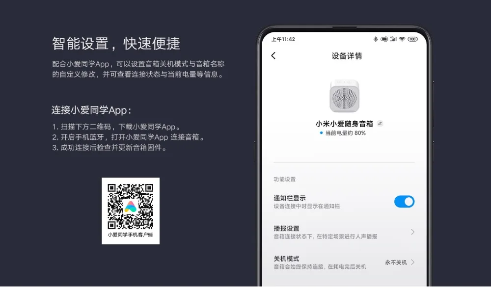 Configuraciones inteligentes, rápidas y convenientesCon la aplicación Xiaoai compañero de clase, puede configurar el modo de apagado del altavoz y el nombre del altavoz.El usuario puede modificar la personalización y ver información como el estado de la conexión y el nivel actual de la batería.Conecta la aplicación de compañero de clase Xiaoai:1.Escanee el código QR a continuación para descargar la aplicación Xiaoai Classmate.2.Encienda el Bluetooth del teléfono, abra la aplicación Xiaoai compañero de clase para conectar el altavoz.3.Verifique y actualice el firmware del altavoz después de una conexión exitosa.